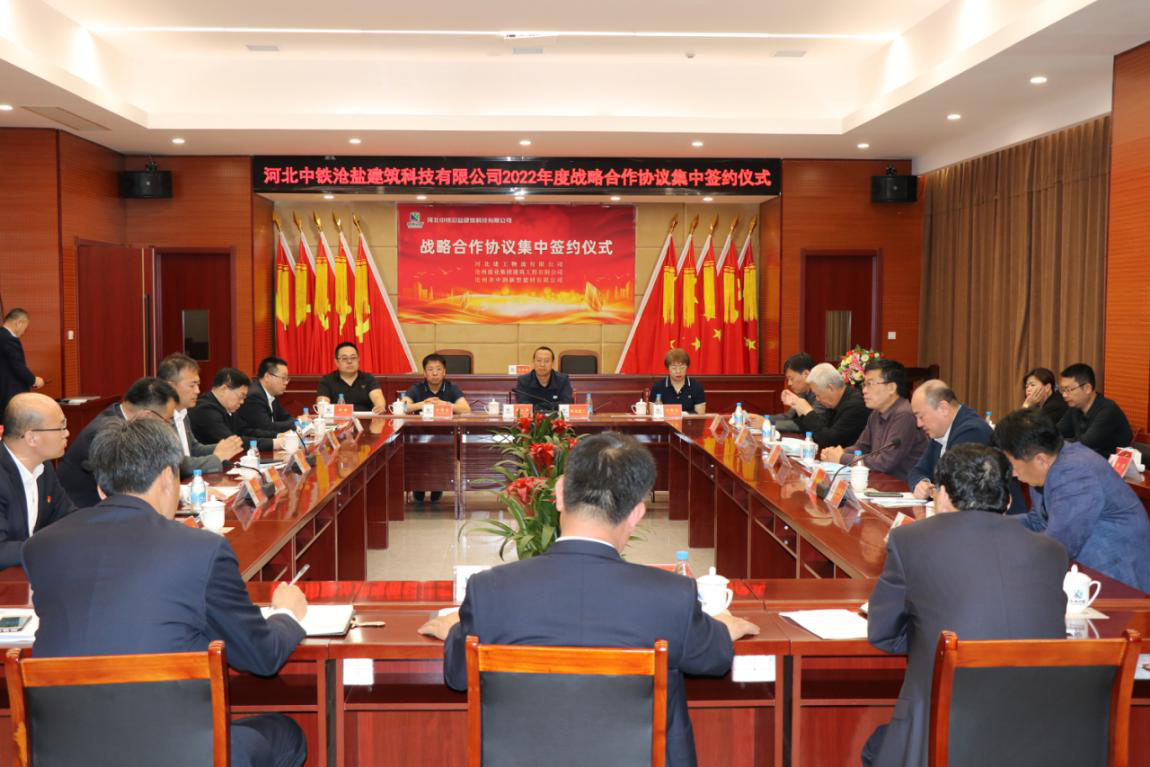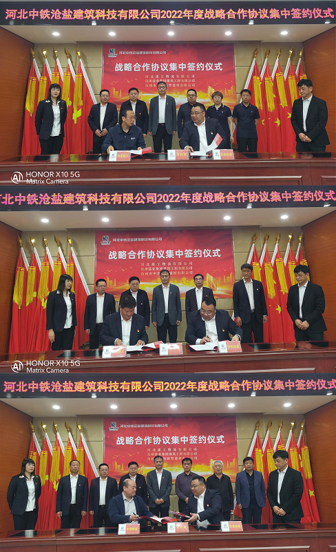 河北中鐵滄鹽建筑科技有限公司執(zhí)行董事長王峰偉,黨支部書記、總經(jīng)理王志巖,總會計師李紅標(biāo),河北建工物流有限公司黨總支書記、董事長劉云濤,雄安區(qū)域總經(jīng)理馮曉潔,雄安區(qū)域副總經(jīng)理李增光,滄州區(qū)域總經(jīng)理李勇,滄州鹽業(yè)集團建筑工程有限公司總經(jīng)理姬文革,黨支部書記、副總經(jīng)理崔治宇,辦公室主任左志海,滄州市中潤新型建材有限公司總經(jīng)理姜海亮出席簽約儀式,三家公司代表分別與中鐵滄鹽簽訂戰(zhàn)略合作協(xié)議。